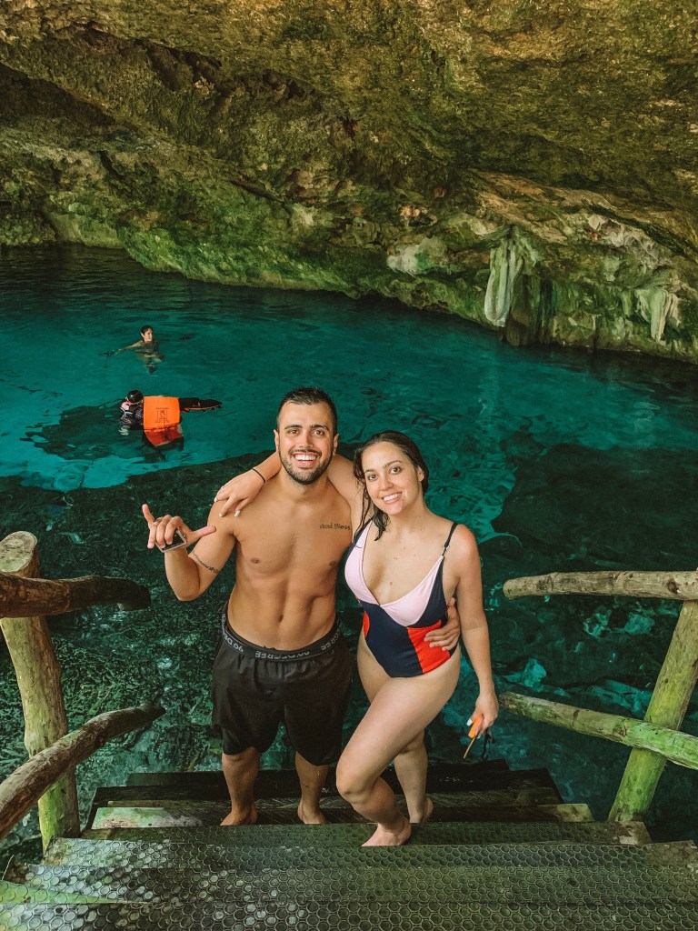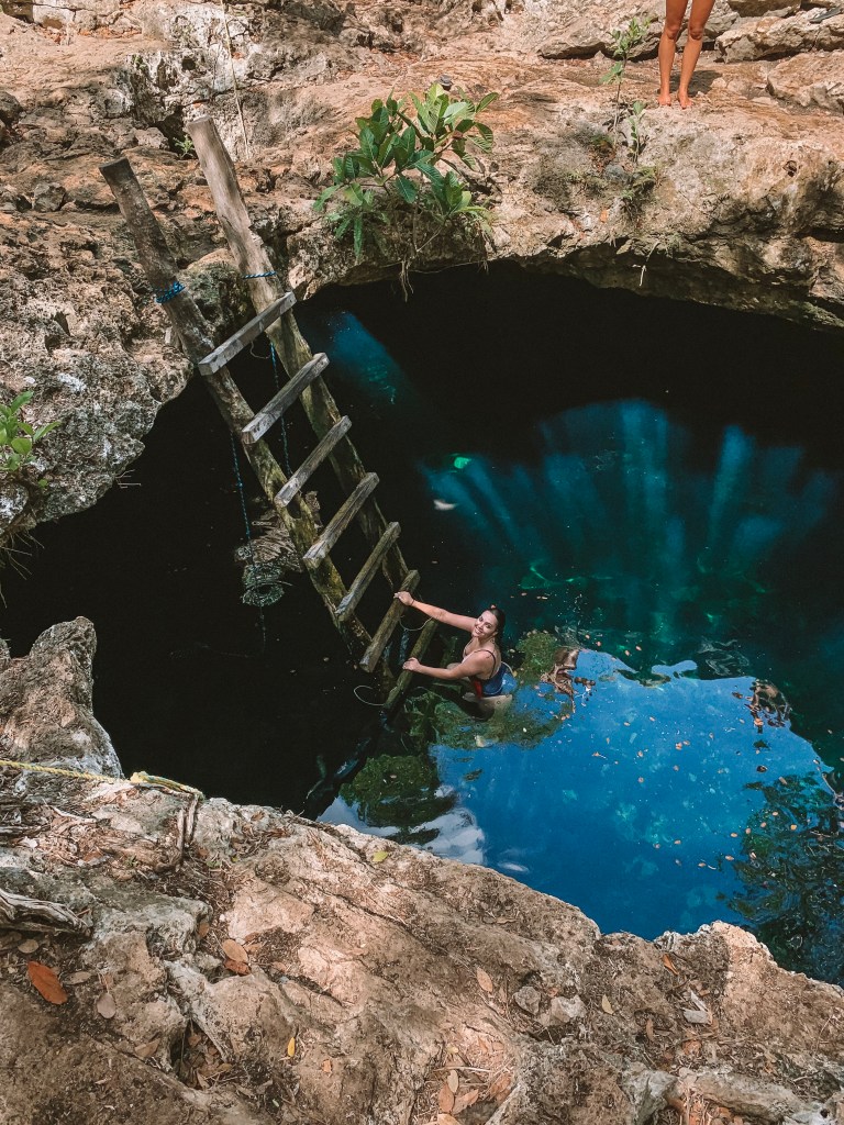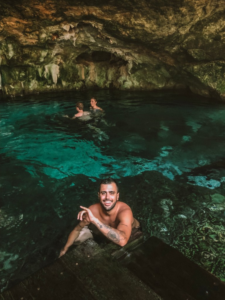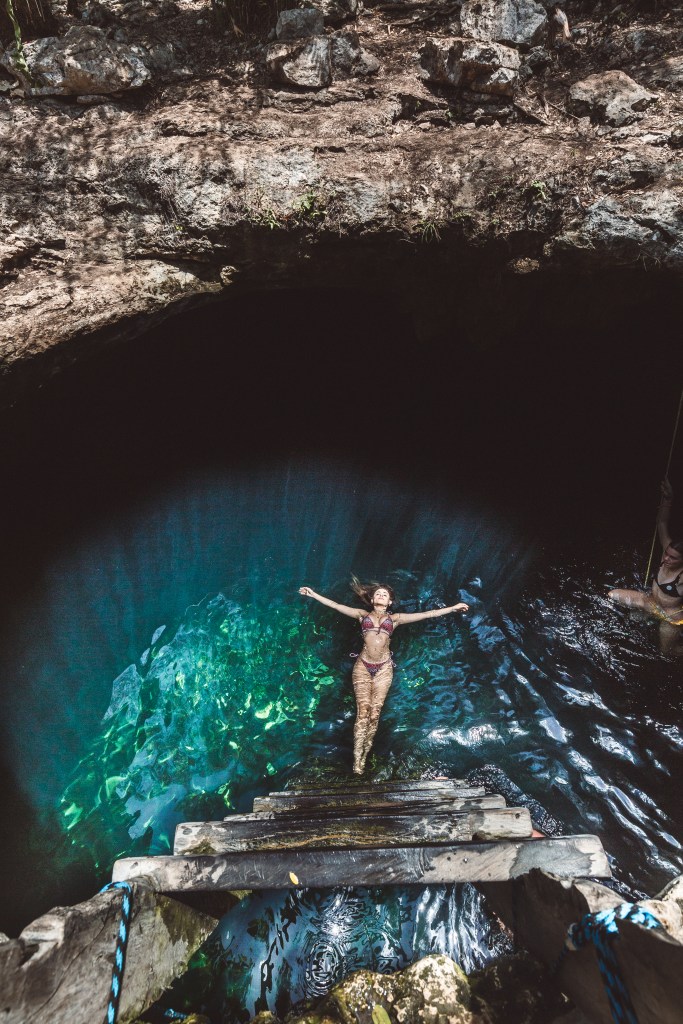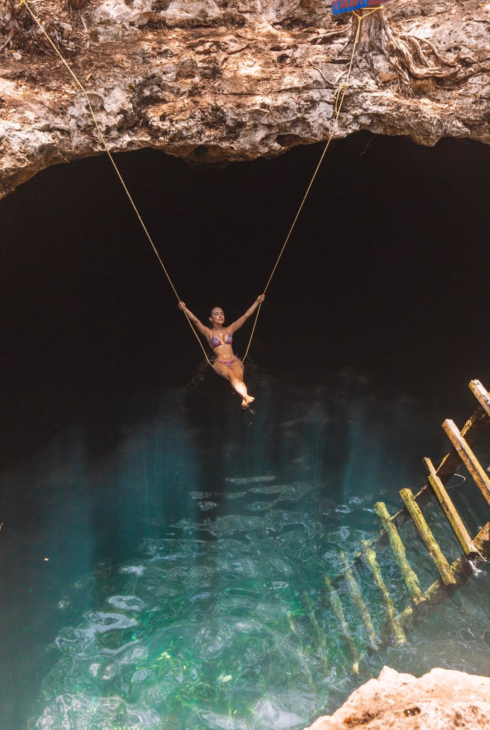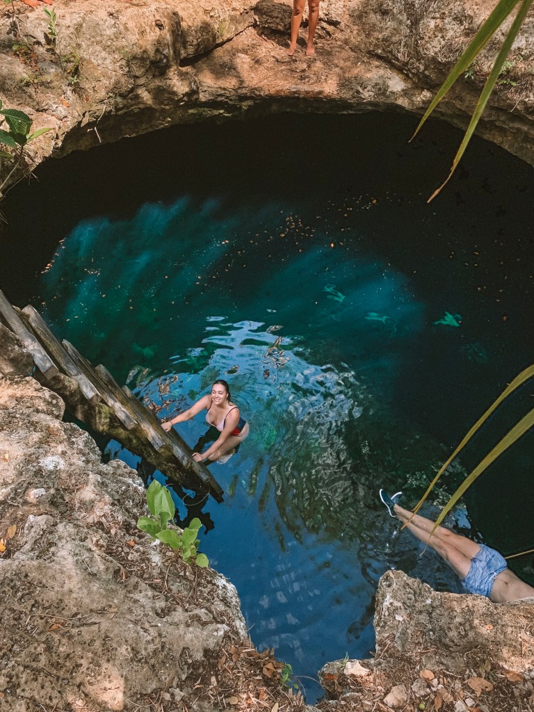 DIA 6 – Seguindo o nosso roteiro, o dia 6 foi o dia de conhecer dois cenotes: o Calavera e o Cenote dos Ojos. Apesar do Cenote dos Ojos ser bem mais famoso, eu tive uma conexão especial com o Calavera (aquele que é um buraco com uma escada de madeira e um balanço de corda dentro).