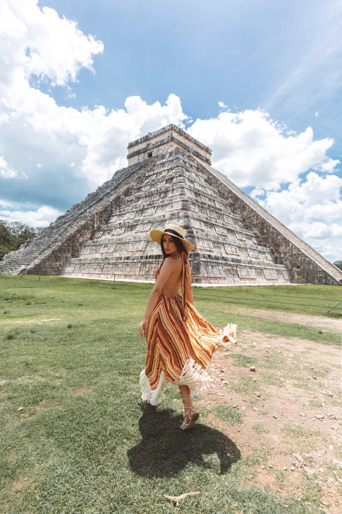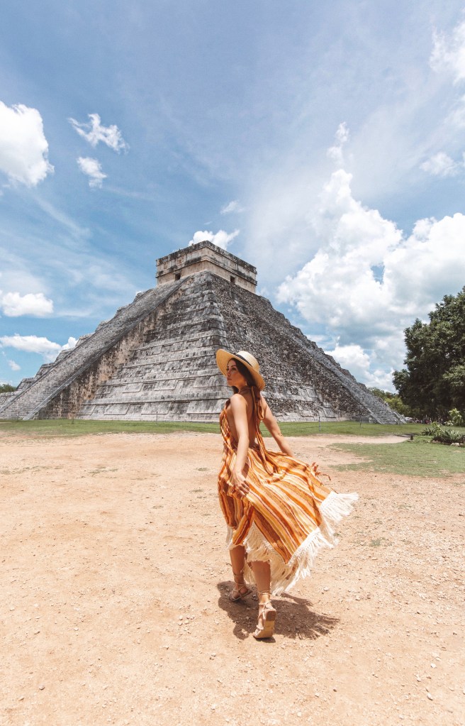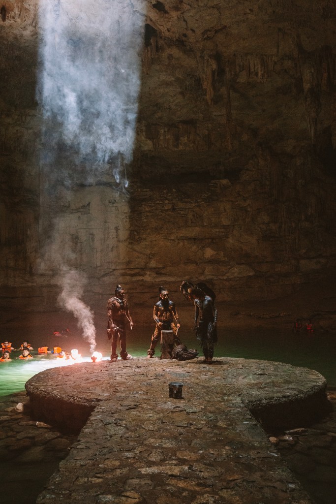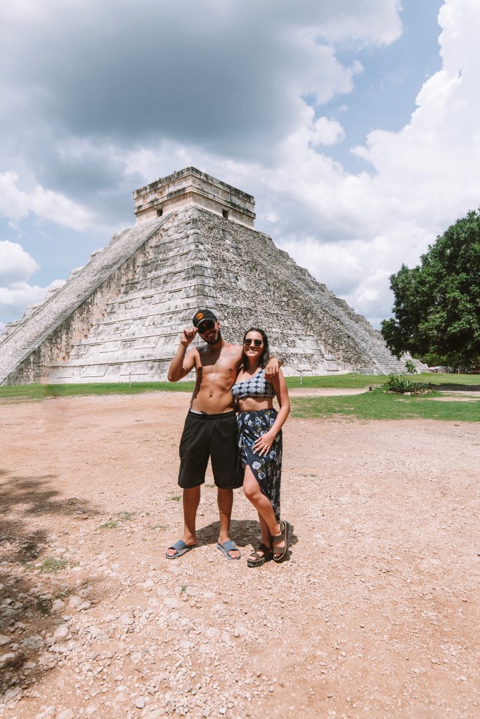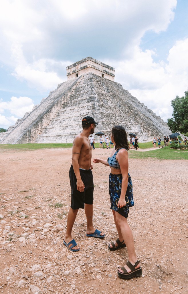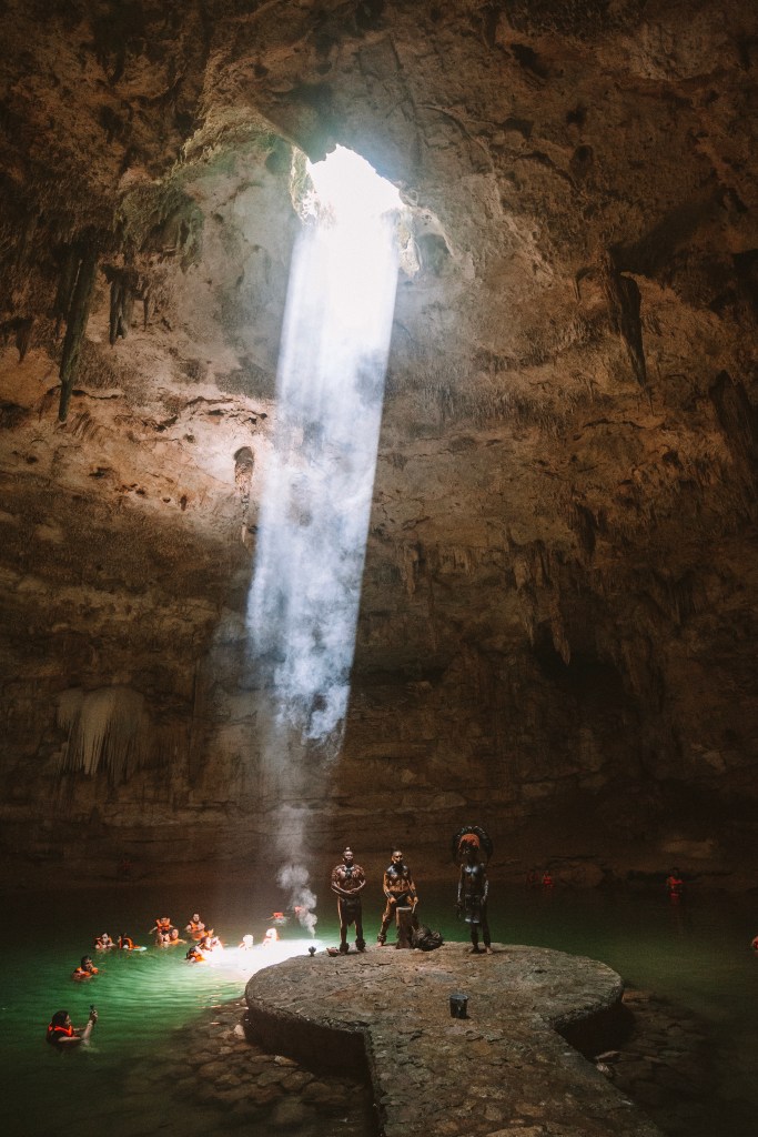 DIA 7 – Nosso último dia de roteiro foi dedicado ao passeio mais caro e mais longe de Tulum (2h de distância). Fomos de van particular para Chichén Itzá, uma importante cidade arqueológica maia, conhecer a Pirâmide de Kukulcán (que significa Serpente Sagrada) e as ruínas de lá. Antes de chegar em Chichén, paramos para conhecer o incrível Cenote Suytun. Se você não sabe o que é, talvez você já tenha visto: é uma gruta, com uma passarela no meio da água e um feixe de luz do sol entrando de um buraco no alto. É quase poético de tão lindo. Ms a poesia acaba rapidinho se você não for cedo para garantir sua foto e curtir o silêncio desse lugar, porque são muitas excursões que chegam e lotam o local. Ao meio dia começam apresentações maias na passarela. Se você quer uma foto com o feixe de luz bem em cima da ponta da passarela, o ideal é por volta das 13h. Mas é bem disputado. A entrada custa 180 pesos, aproximadamente R$45,00.