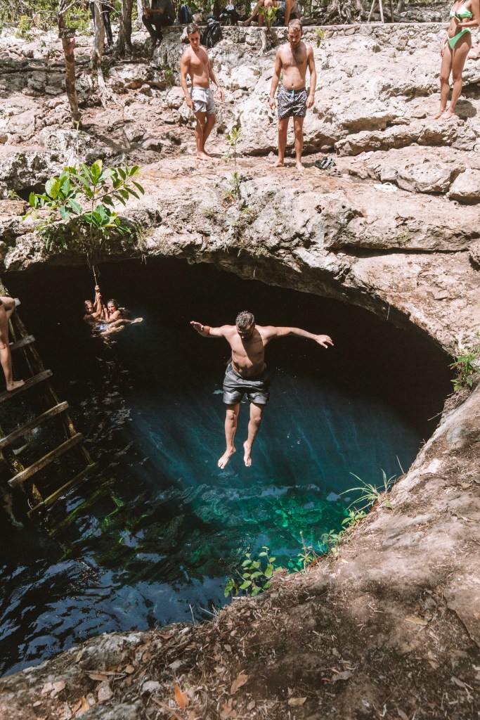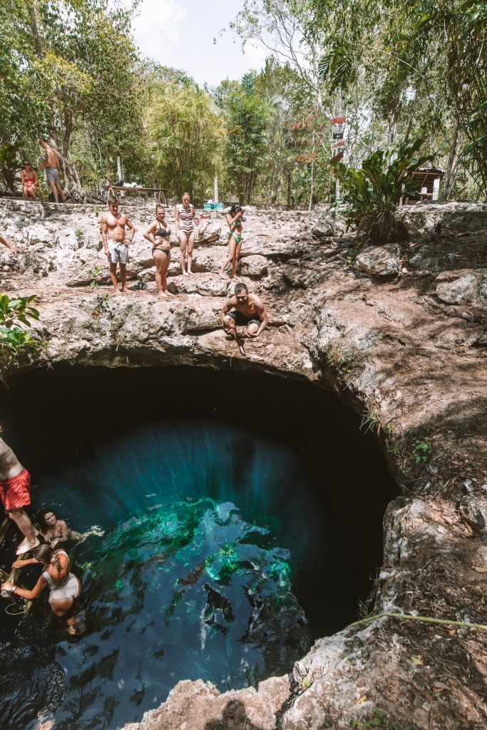 Com certeza você já viu muitas fotos bem blogueirinhas pelo Instagram ou Pinterest nesse lugar. E é realmente impossível não querer uma foto dessas. Mas já aviso que se o interesse for uma foto bem lindona sem ninguém aparecendo é bom chegar cedo, porque ele pode não ser tão famoso quanto os outros, mas está ficando! É um pulando atrás do outro nesse buraco enorme. É uma queda de aproximadamente 3,5 metros. E a profundidade nessa área principal é de 4 metros, mas se você se afastar um pouco, a profundidade pode chegar a 19 metros em outros pontos. Pagamos 100 pesos mexicanos para entrar, em torno de R$25,00.
