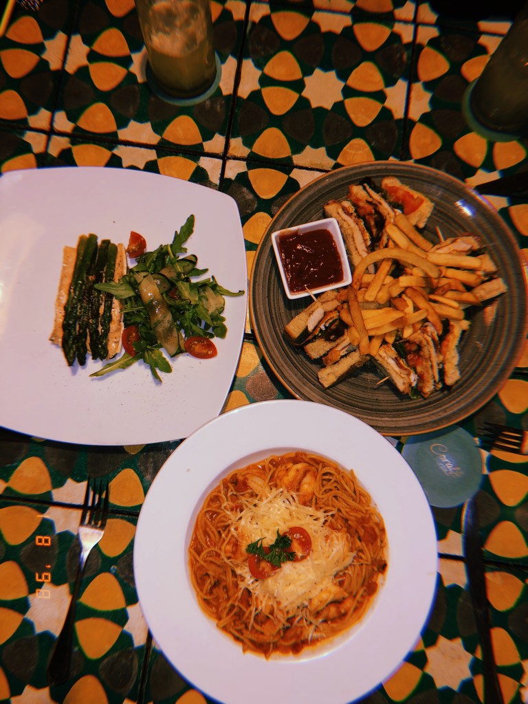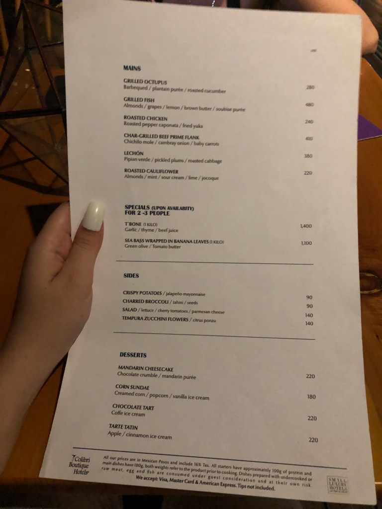 Como chegamos tarde, arrumamos as nossas coisas, tomamos banho e fomos jantar. A escolha foi o restaurante Coral, quase ao lado do hotel. Os restaurantes em Tulum não são baratos, inclusive comer por lá saiu mais caro do que imaginei. Além dos valores dos pratos, você ainda paga a taxa e a gorjeta. Em refeições como almoço ou jantar você gasta em média R$90,00 por refeição. Por fim, voltamos ao hotel e descansamos.
