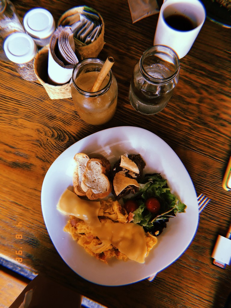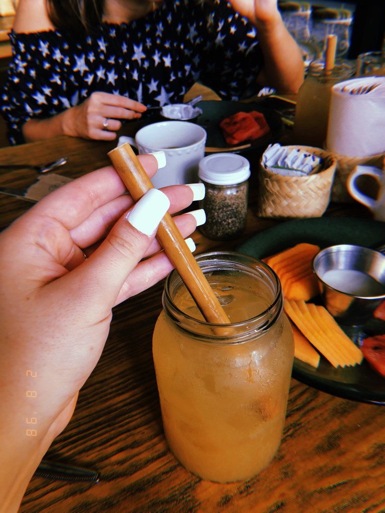 Em seguida, continuamos na avenida até parar no Matcha Mama, um lugarzinho pequeno e rústico que vende chás, açaí, smoothies etc. É super famoso na região e no Instagram, já que muitos turistas param para beber algo e aproveitam para tirar fotos nos balanços. Mais à frente, encontramos a famosa placa “Follow That Dream” que faz sucesso nas fotos turísticas também. No caminho de volta, paramos no restaurante La Onda, ao lado do Matcha Mama, para almoçar. Pedimos duas pizzas para dividir.