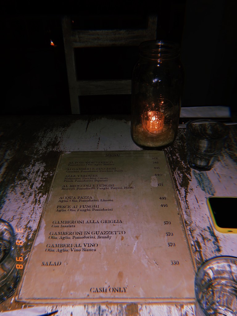 À noite, acabamos jantando no Posada Margherita, um restaurante/pousada bem tradicional que ficava exatamente ao lado do nosso hotel. Eles têm o mesmo cardápio há 20 anos! E tem a opção do restaurante (virado para a praia) e a opção da pizzaria (virada para a rua). Uma delícia e o cenário parecia de cinema.