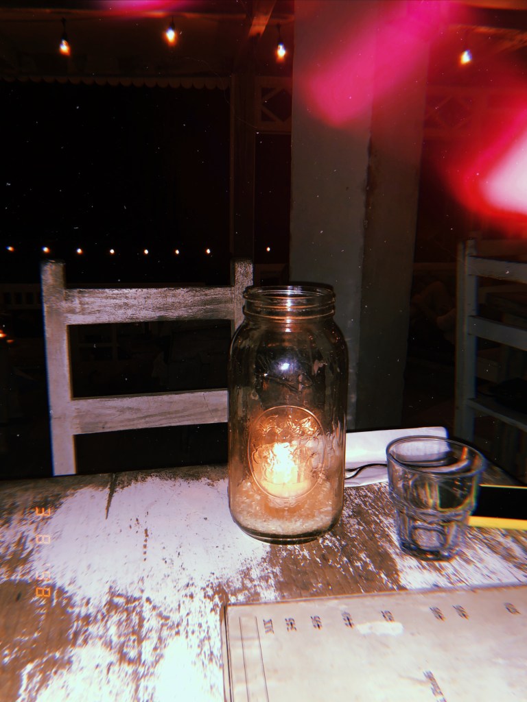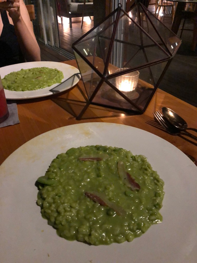 A Casa Emily é perfeita para quem gosta do rústico com um certo conforto. É uma casa bem aconchegante, com porta direta para a praia e que promove uma experiência de muito contato com a natureza. Apesar da rusticidade, lá tem wifi, água quente e ar condicionado para que o convidado tenha uma boa estadia. Nesse dia, jantamos no restaurante/hotel ao lado, o “Mi Amor”. Pedi o risoto e o preço era bom, mas achei mal servido. Achei que poderia vir uma quantidade maior de comida, mas… a experiência é bem bacana já que o local é lindo e inclusive estava tocando Águas de Março. Achei o máximo.