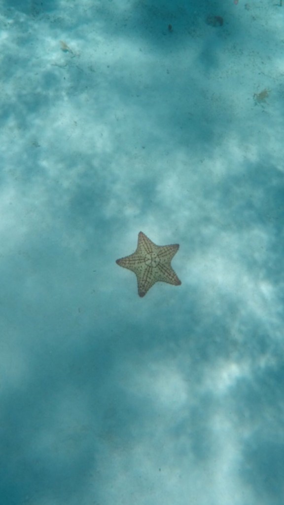 Chegando em Cozumel (45 minutos de embarcação), fomos divididos em grupos menores para conhecermos os recifes em barcos menores. Fizemos duas paradas: no Recife Columbia (10 metros de profundidade) e no famoso El Cielo, dono de águas inacreditáveis de tão lindas. Usamos coletes salva vidas apenas no Columbia, por conta da profundidade, no El Cielo não usamos porque a área em que estávamos tinha 1,5m de profundidade. Vimos muitos peixes. Olhar embaixo d’água naqueles lugares era como descobrir um universo paralelo. Em El Cielo encontramos uma estrela do mar. Linda! Uma experiência única. Ainda mais conhecendo a segunda maior barreira de corais do mundo.