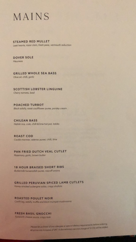 O 24 Mayfair tem uma infinidade opções que vai desde comida asiática (um cardápio) a opções de grill. São dois cardápios diferentes. Nós provamos um combinado do cardápio asiático, com sushis e sashimis e depois, cada uma pediu um prato principal do segundo cardápio. A minha escolha foi uma Short Ribs (costela) cozida por 18 horas acompanha de um purê amanteigado de rabanete, que custava 34 libras, ou seja R$204,00. Realmente é um restaurante para quem pode e quer gastar esse dinheiro. Mas é uma experiência muito legal, comida boa e um ambiente muito gostoso.