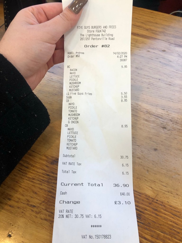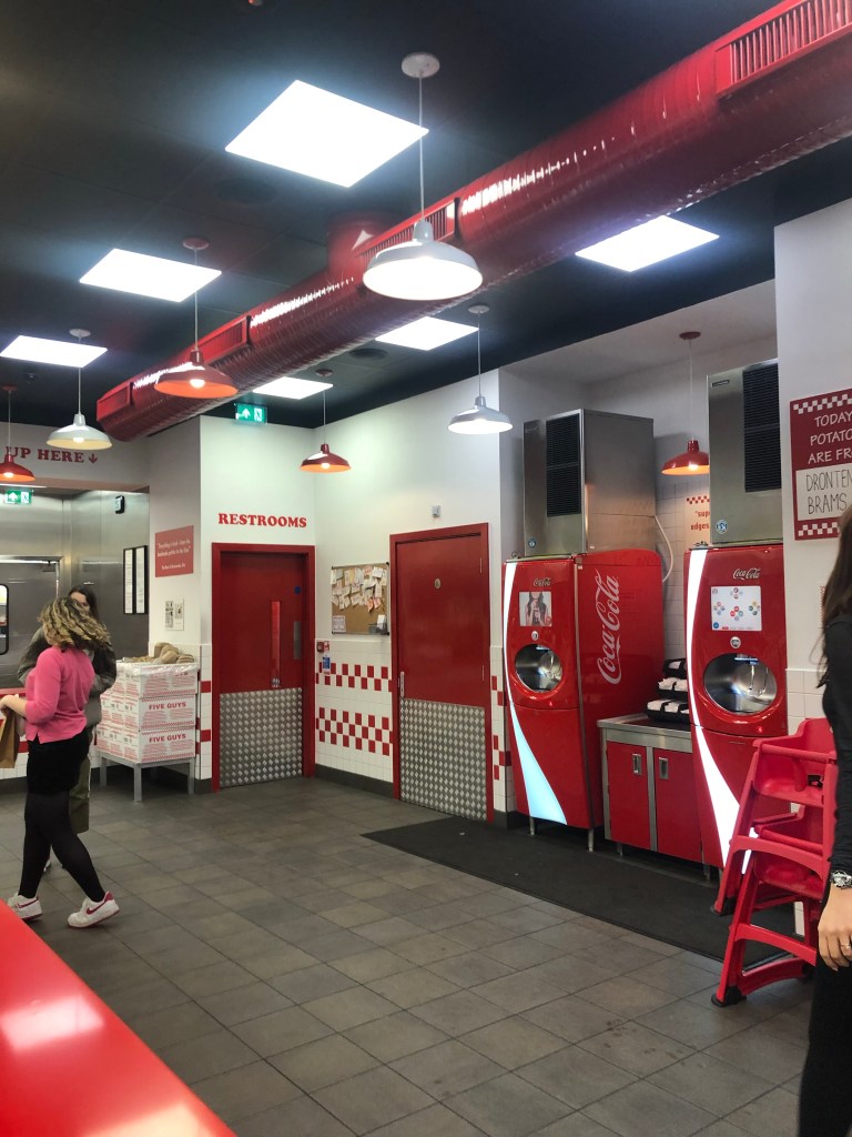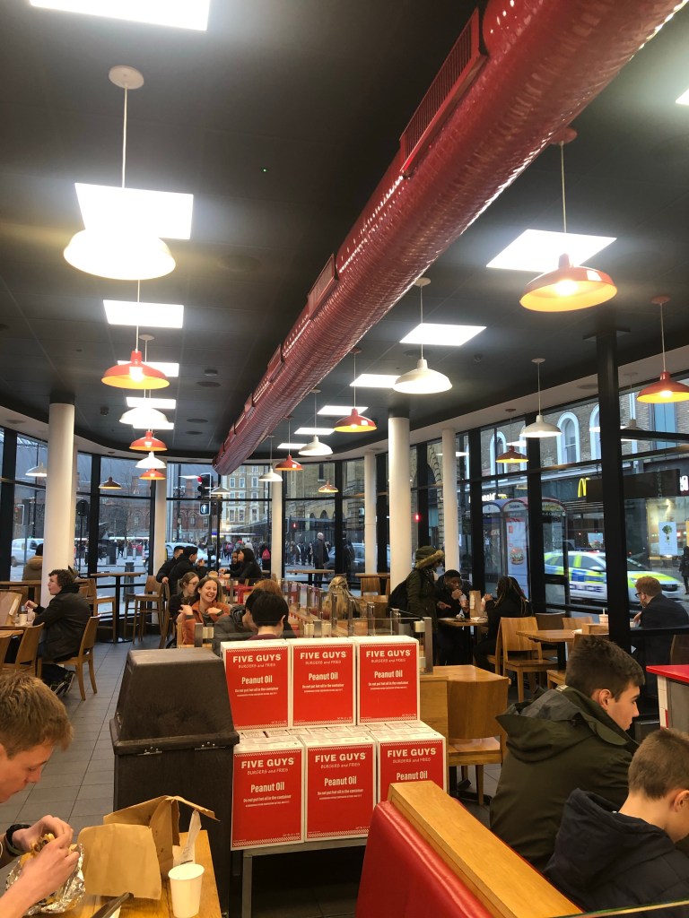 Logo após deixar nossas malas em nosso primeiro hotel, descobrimos um Five Guys bem próximo a Estação Kings Cross e decidimos jantar por lá. Eu gosto muito de Five Guys e como bastante nas minhas viagens para os Estados Unidos. Já acho caro por lá, em Londres então, por ser em libra, fica ainda mais caro. Pegamos 3 lanches, 1 batata para dividir e 1 refrigerante refil para dividir e pagamos quase 37 libras, em torno de R$222,00. Bem caro por ser um fast-food, né? Mas na realidade é caro para nós, já que a 1 libra vale mais de 6 reais.
