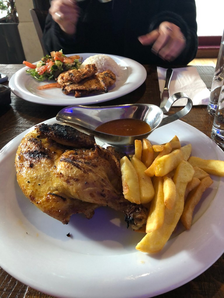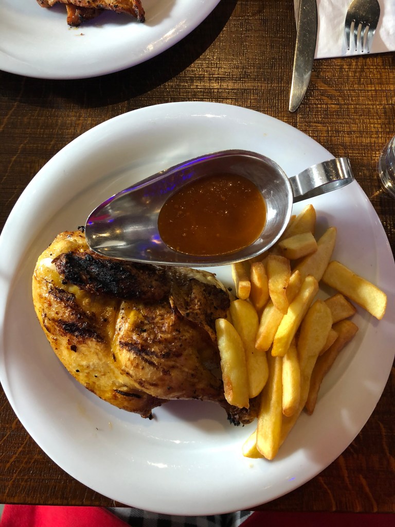 O Westminster Kitchen Grill House fica na região da London Eye e, como todo restaurante que fica próximo aos pontos turísticos, era um pouco caro. Pesquisamos muito no Google os restaurantes próximos e seus valores e não achamos nada barato. Na hora de escolher os pratos, eu optei pelo Half Chicken, que era literalmente metade de um frango assado e batatas rústicas. As meninas optaram pelo Chicken Filet, dois filés de frango, arroz e salada. Meu prato custou 14,95 libras e o das meninas 13,95 libras cada. Achei meu prato bem gostoso, apesar de caro.