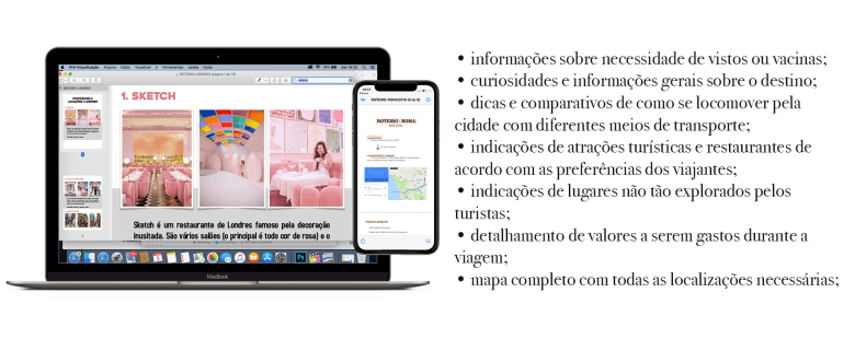 Nós montamos o roteiro perfeito – de acordo com o orçamento e as necessidades de cada viajante – e elaboramos e enviamos um roteiro em PDF com: